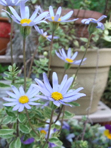 3年間から同じ鉢に植えっぱなしのブルーデイジーが、今とても綺麗に咲いてまー。