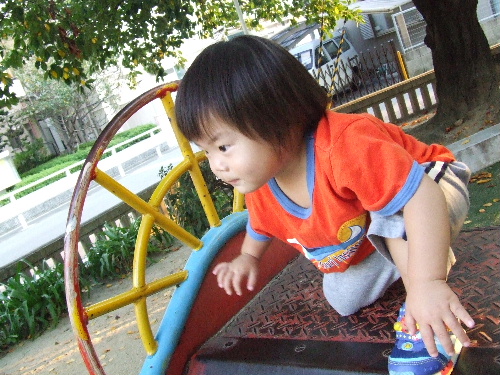 まず公園への3分ほどの道のりでもばあばとママの手にぶらさがって大はしゃぎだったのが、公園へ着くともっと大はしゃぎ。まっさきに滑り台へ。