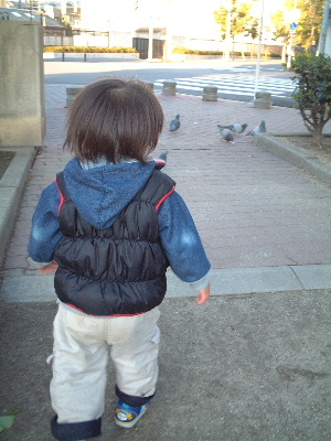 ←鳩を追いかけるが…当然鳩の方がまだ知能は高い様子で、けいたんまんにつかまる前に飛び立つ。だけど、楽しいのだ♪