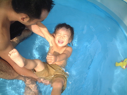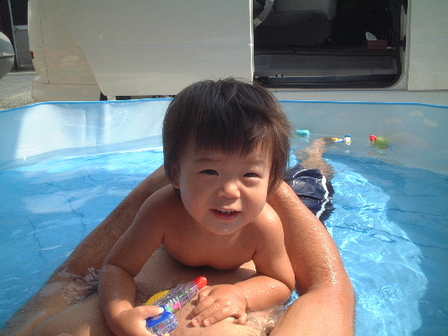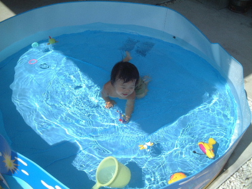 予告通り、午後はプールに入った。割と大きいプールでなかなか良い。独りじゃ寂しいと思い、ご近所のOさん宅へ2週間違いのK君を誘いに行ったのだが、時間が悪かった。お昼寝中だった。