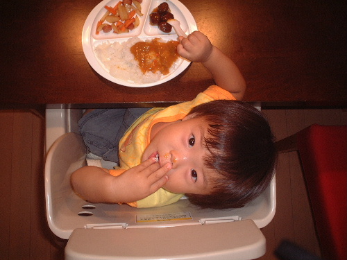 すさまじい食い散らかし様なのだが、ママは息子の成長の為に、ぐっと我慢。そっと見守る。(いや、叱ってるか。) 散らかすので、食べさせてあげようとすると、怒るのだ。自分で食べるそうな。