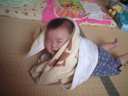 毛布に巻き付いて、大笑い。この子、早いうちから大人のように「ひっくひっく」言って笑っていた。