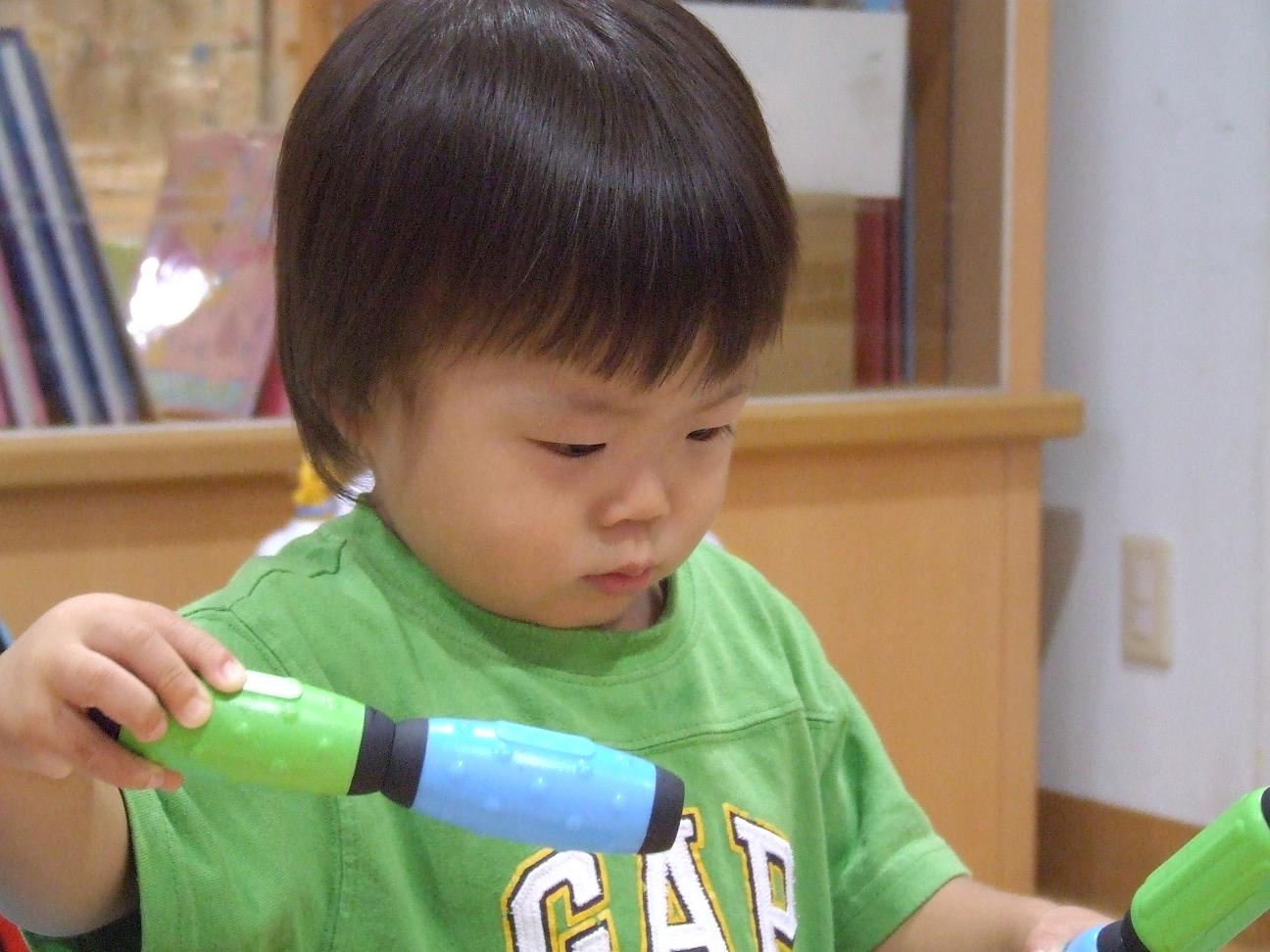 いつもおもちゃに向かう時は、こんな真剣な表情だ。最近、磁石に凝っているので、この磁石のおもちゃは気に入ったようだ。