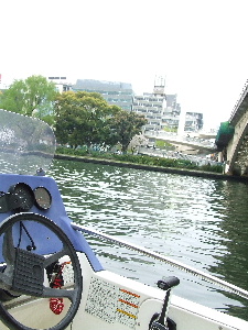 手がつけられなくなってきたので、ボートに乗ることに。よっしーの友人所有の釣り船だ。これで寝屋川(だっけ?)を遊覧。スージーもけいたんまんもご機嫌。